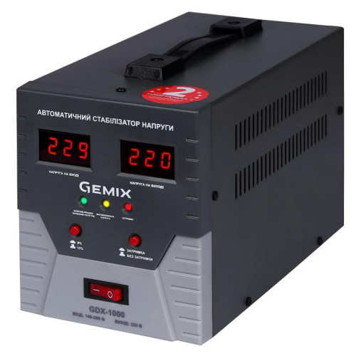 Gemix GDX-1000 - стабілізатор напруги релейного типу. Захистить під'єднані пристрої від різноманітних недоліків електромережі. Розрахований на під'єднання пристроїв загальною потужністю 700 Вт.